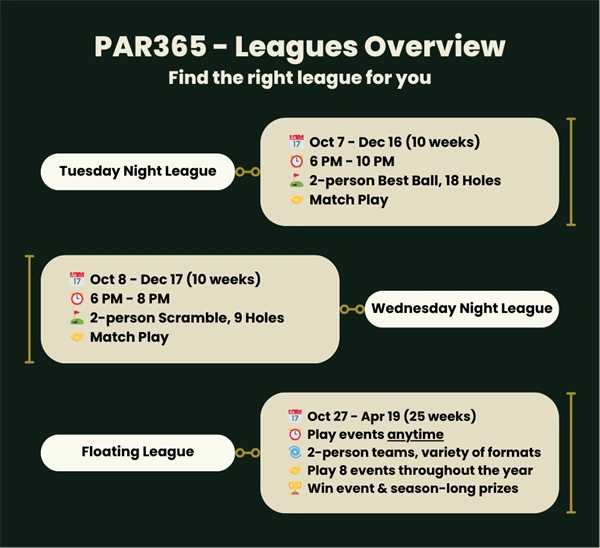 The 2025 Monday Night League at Element Indoor Golf Vadnais Heights runs from October 13 to December 15, with play beginning at 7:00 PM every Monday night.